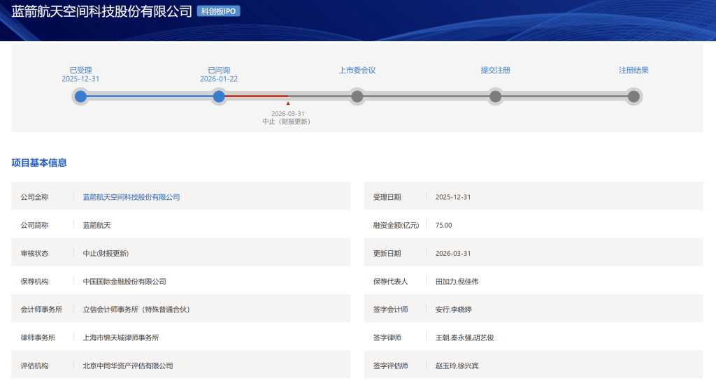 3月31日,据上交所官网显示,正在冲刺中国“商业航天第一股”的蓝箭航天科创板IPO变更为中止状态,引发网友关注。