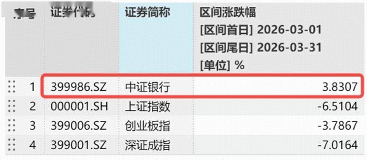 回顾3月以来表现,中东地缘风险持续扰动市场情绪,银行板块频频走出逆市表现。中证银行指数本月累计上涨3.83%,涨幅高居所有中证全指二级行业指数首位,同期上证指数、创业板指、深证成指分别下跌6.51%、3.79%、7.02%,银行板块相对沪指超额10.34%。