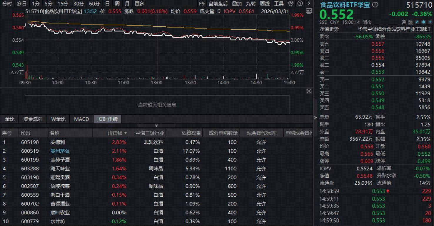 吃喝板块逆市显韧性。反映吃喝板块整体走势的食品饮料ETF华宝(515710)开盘后迅速拉升,盘中场内价格一度涨近2%,随后震荡回落,截至收盘,跌0.36%。