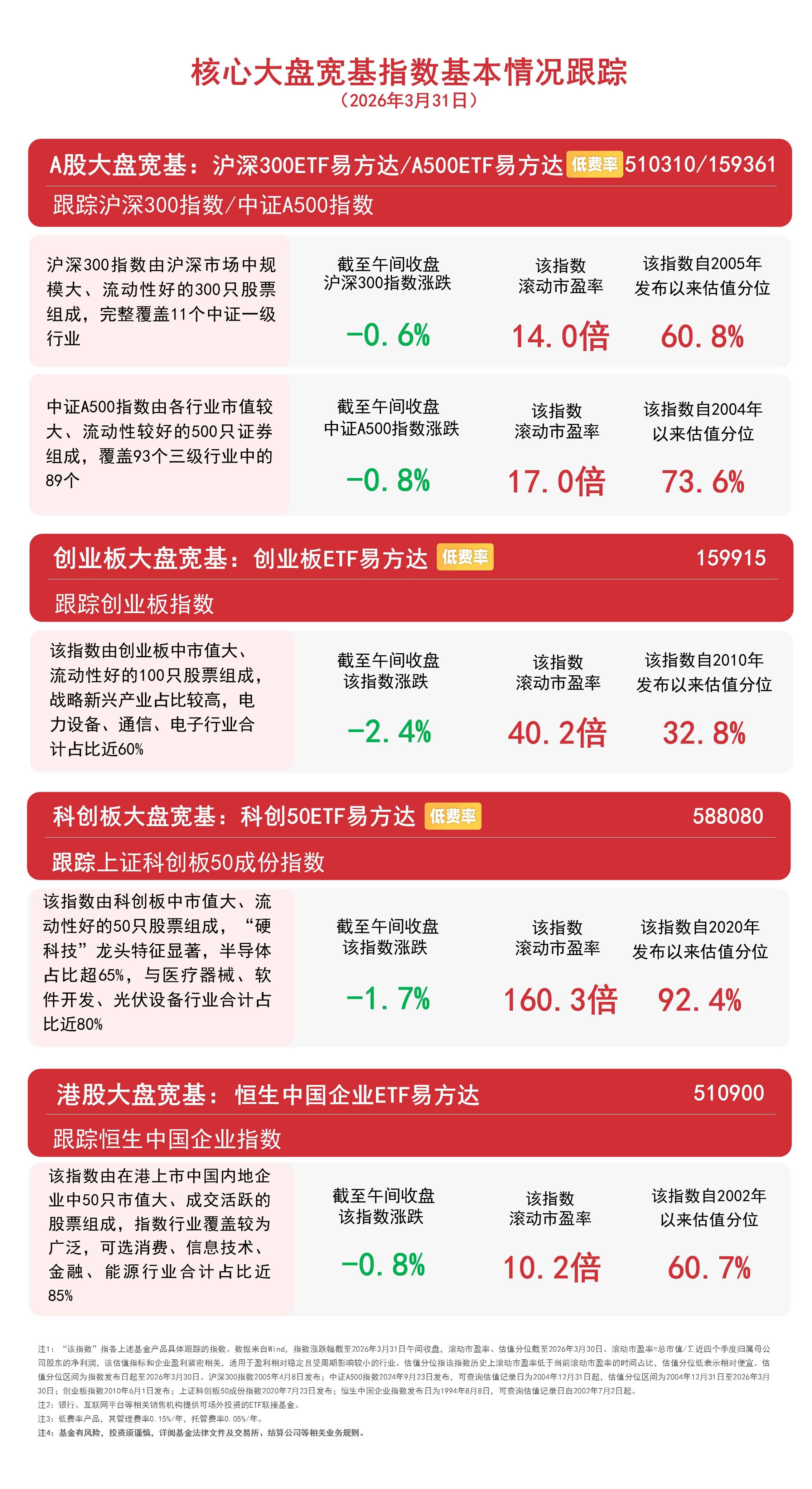 截至午间收盘,中证A500指数下跌0.8%,沪深300指数下跌0.6%,创业板指数下跌2.4%,上证科创板50成份指数下跌1.7%,恒生中国企业指数下跌0.8%。