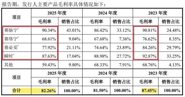 然而,这种“以价换量”的策略并未有效提升盈利能力。与前期相比,公司的毛利率已出现下降。2023年至2025年,公司四款主要产品的毛利率均呈普遍下降态势;整体毛利率由2023年的87.45%降至2025年的82.26%,“以价换量”的销售模式正在逐步侵蚀公司的盈利空间。
