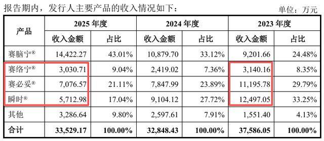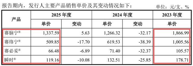 2023年下半年起,赛克赛斯主动调整并优化销售体系,加大了经销商布局力度。由于经销定价远低于直销和配送模式,产品单价被直接拉低。2023年至2025年,公司四款主要产品的销售单价普遍下降。其中,公司营收占比最大的核心产品赛脑宁的销售单价降幅达28%,赛必妥的销售单价降幅达37%。