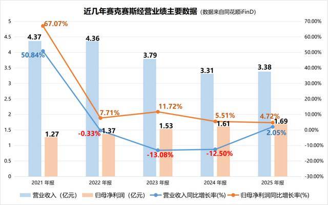 近年来,赛克赛斯营业收入呈普遍下降态势,2023年至2025年营业收入的复合增长率为-5.54%,增长动能不足。