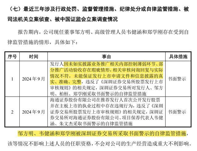 早在第二次IPO时期,证监会现场检查时发现赛克赛斯存在多项违规行为。2024年9月,深交所对赛克赛斯及实控人邹方明等、彼时的保荐机构海通证券与审计机构信永中和等出具书面警示监管函,指出公司业务推广相关内部控制存在薄弱环节,且公司相关审核问询回复与实际情况不符,信息披露不真实。