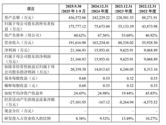 业绩方面,力高新能近年来表现亮眼。2023年至2025年前三季度,力高新能分别实现营业收入8.03亿元,16.33亿元和19.16亿元,最近三年营业收入复合增长率达到70.85%;净利润分别为0.96亿元,1.6亿元和2.12亿元,净利润同步实现稳健增长。