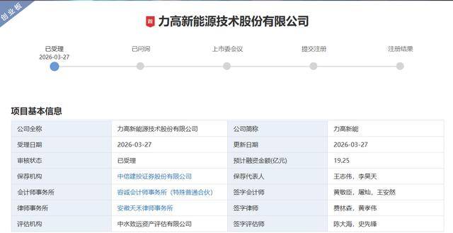 3月27日,深交所官网显示,力高新能源技术股份有限公司(简称“力高新能”)创业板IPO获深交所受理,公司拟募资19.25亿元。
