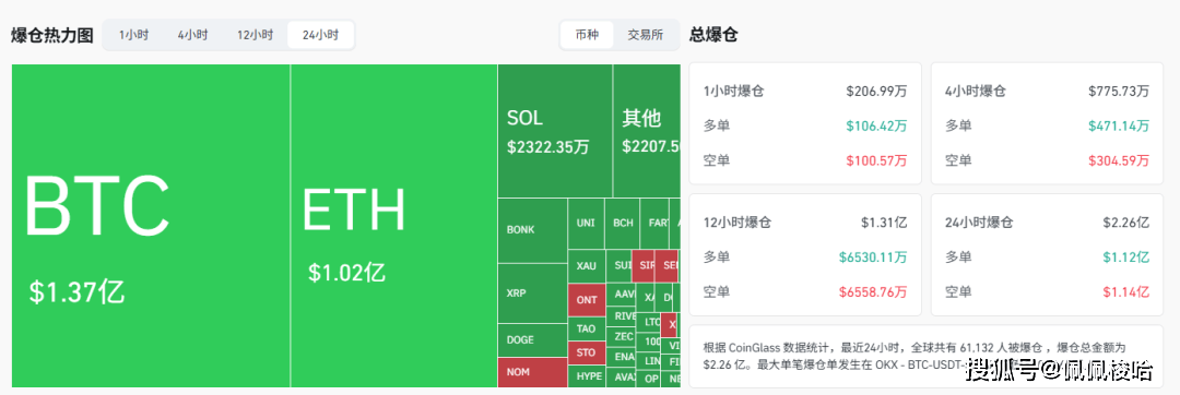 过去24小时内,全球共有61,117名交易者遭遇爆仓,累计爆仓金额高达2.26亿美元。