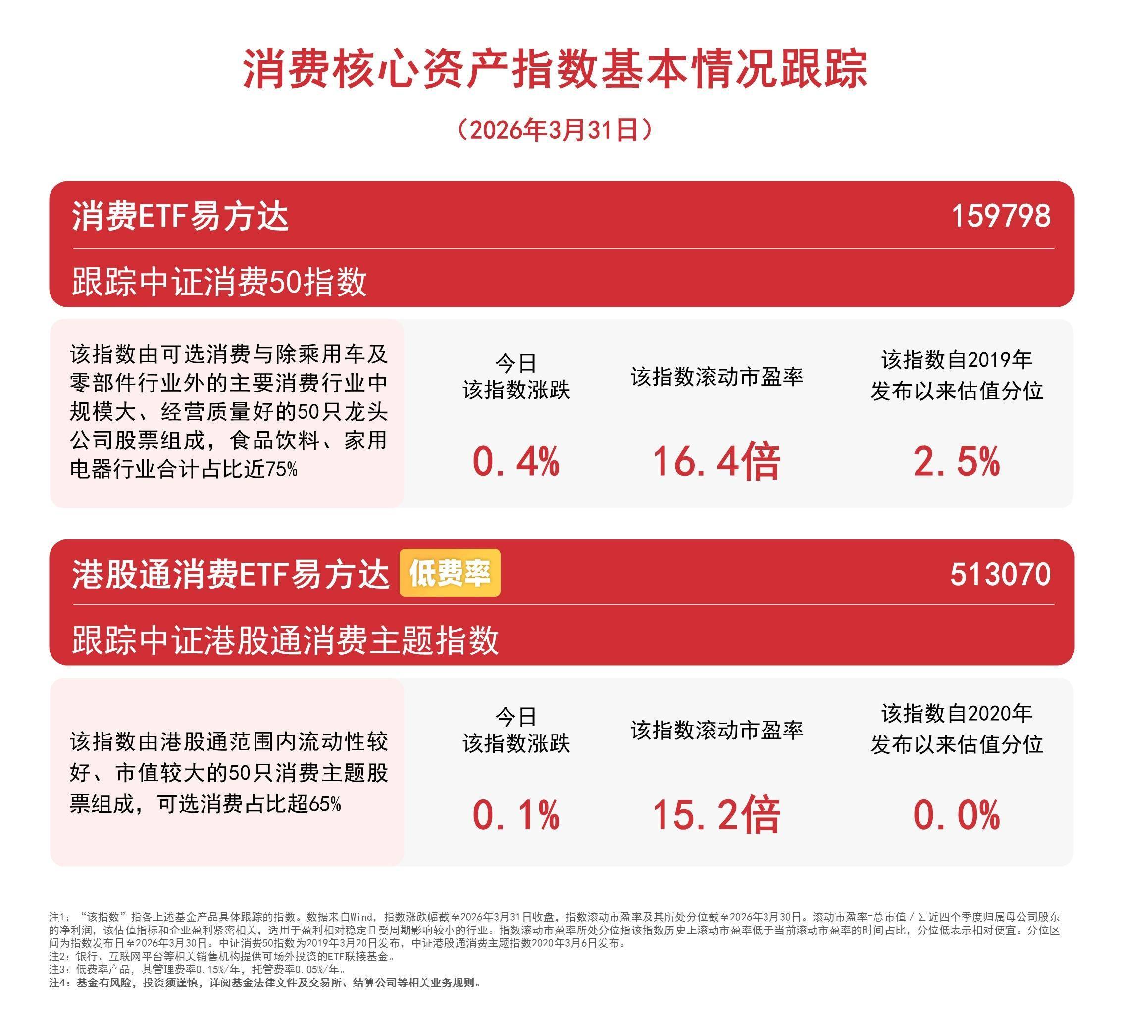 3月31日,市场冲高回落,家电、食品饮料等消费板块逆势活跃,截至收盘,中证消费50指数上涨0.4%,中证港股通消费主题指数上涨0.1%。相关ETF中,消费ETF易方达(159798)和港股通消费ETF易方达(513070,联接基金A/C:018103/018104)近3个交易日分别获700万元和3600万元资金净流入。