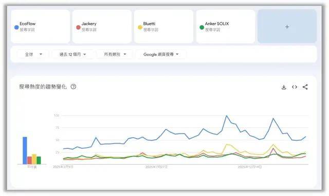 德兰明海的“BLUETTI”品牌也在海外获得了广泛认可,根据弗若斯特沙利文的数据显示,在2023年、2024年和2025年,“BLUETTI”在谷歌趋势便携式储能产品类别的平均搜索热度均位列全球前两名。在近一年内,在行业四大企业中,德兰明海的“BLUETTI”在行业搜索中仍排名第二,拥有如此的品牌力,无疑能使德兰明海在市场中获得了极大的关注度。