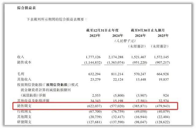 事实上,为了维持行业第四的排名,德兰明海事实上不得不维持着高昂到令人咋舌的销售及营销开支,以烧钱换增长。2023年至20259月,德兰明海的销售开支分别为6.22亿元、5.77亿元、4.8亿元。2025年前九个月,公司的销售开支已经占到同期收入的30.5%。