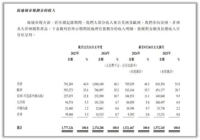 同时,德兰明海的生存异常脆弱。根据招股书,德兰明海超过97%的收入来自于海外,2025年前9个月,德兰明海在中国内地的收入占比仅有2.2%,而美洲占比达到了51.9%、欧洲占比达到了28.7%。在2026年,全球地缘政治愈发紧张的当下,任何一点风吹草动都有可能摧毁德兰明海多年来的努力。