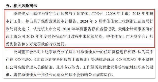 2024年5月季佳佳收到浙江证监局行政处罚决定书,认定该上市公司2018年年度报告存在虚假记载,天健会计师事务所在该上市公司2018年年度财务报表审计过程中未勤勉尽责,季佳佳作为签字会计师受到警告和5万元罚款的行政处罚。