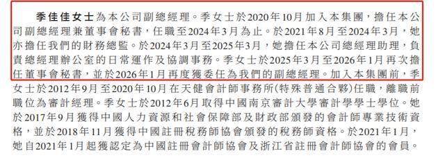 在于2021年8月至2024年3月,季佳佳也担任公司的财务总监;于2024年3月至2025年3月,她担任公司总经理助理,负责总经理办公室的日常运作及协调事务。