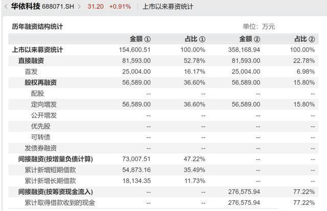 根据WIND数据,自华依科技上市以来,累计直接融资金额约8.16亿元。其中,首发融资约为2.5亿元,定增融资约5.66亿元。