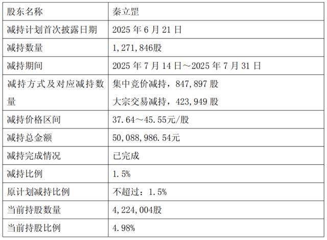 2025年7月14日-2025年7月31日,前董事秦立罡减持公司1.5%的股份,变现约5008.9万元。