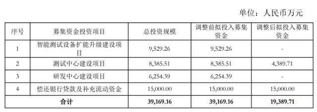 而在上市仅一个多月后,公司便对募投项目拟投入的募集资金规模进行调整:“智能测试设备扩能升级建设项目” 与 “研发中心建设项目”拟投入募集资金均调减至0,“测试中心建设项目”募集资金投入由8385.51万元下调至4389.71万元,唯有“补充流动资金及偿还银行贷款”的资金规模保持不变。