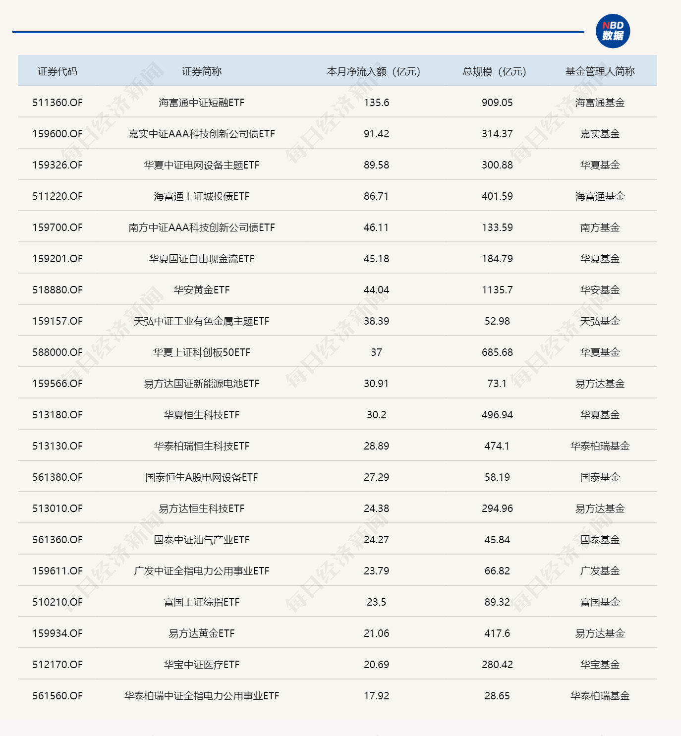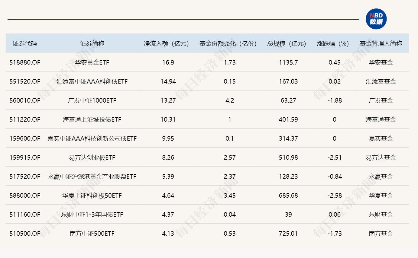 Wind数据显示,在3月31日的非货币ETF市场中,华安黄金ETF基金份额增加1.73亿份,净流入额16.90亿元;汇添富中证AAA科创债ETF基金份额增加0.15亿份,净流入额14.94亿元;广发中证1000ETF基金份额增加4.20亿份,净流入额13.27亿元。