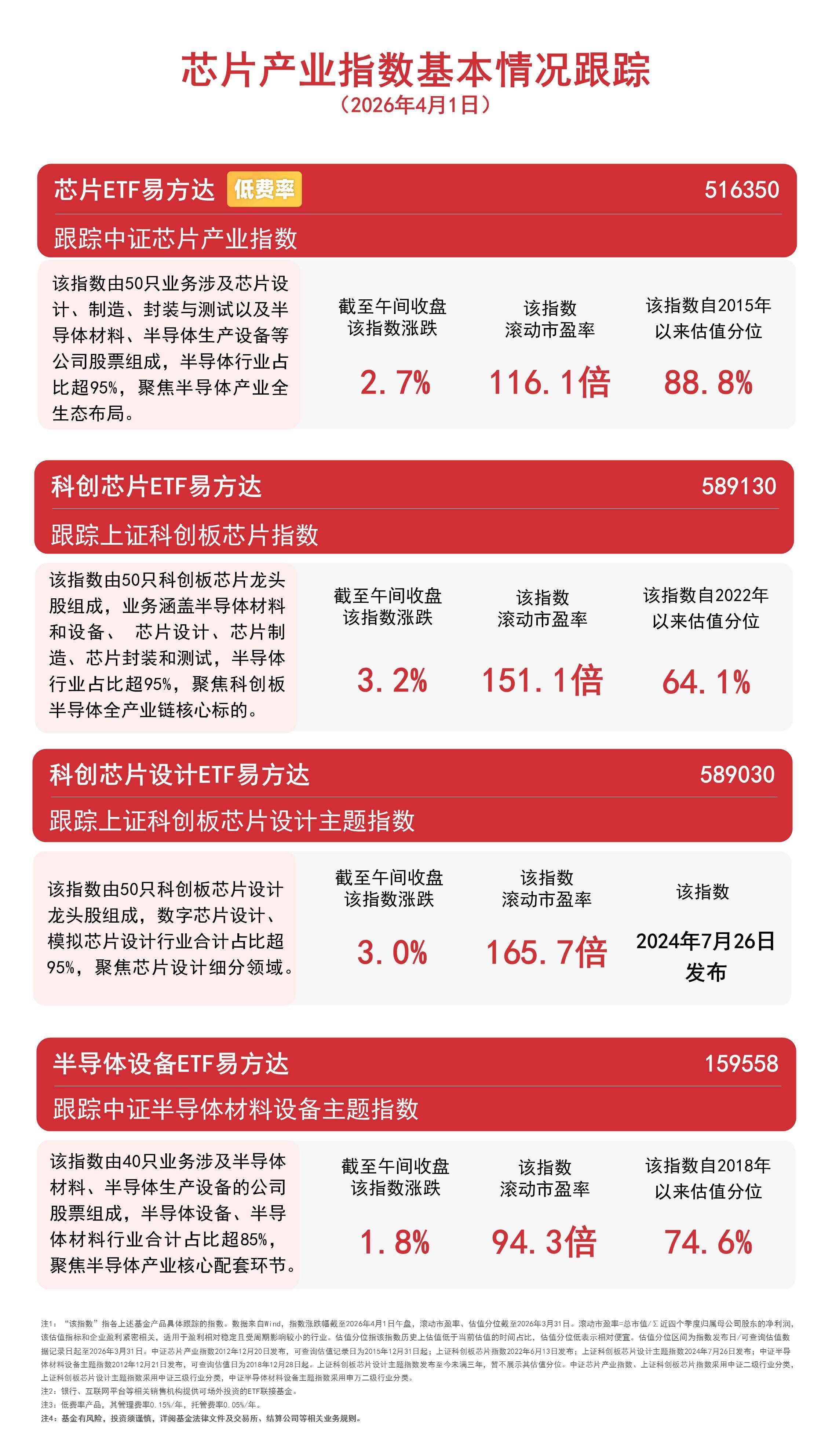 4月1日,半导体产业链股集体走强,截至午间收盘,芯原股份涨超9%,寒武纪、华虹公司、天岳先进涨超6%,指数方面,上证科创板芯片指数上涨3.2%,上证科创板芯片设计主题指数上涨3.0%,中证芯片产业指数上涨2.7%,中证半导体材料设备主题指数上涨1.8%。