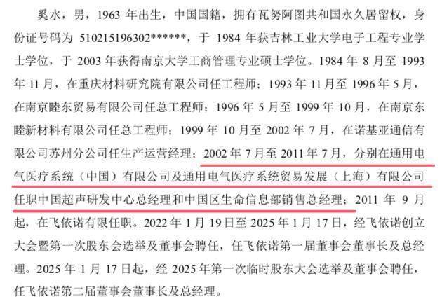 奚水,1963年出生,中国国籍,拥有瓦努阿图共和国永久居留权,1999年10月至2002年7月,奚水在诺基亚通信有限公司苏州分公司任生产运营经理;2002年7月至2011年7月,在通用电气医疗系统分别任职中国超声研发中心总经理和中国区生命信息部销售总经理;2011年9月起,在飞依诺有限任职。2022年1月,任飞依诺董事长及总经理。