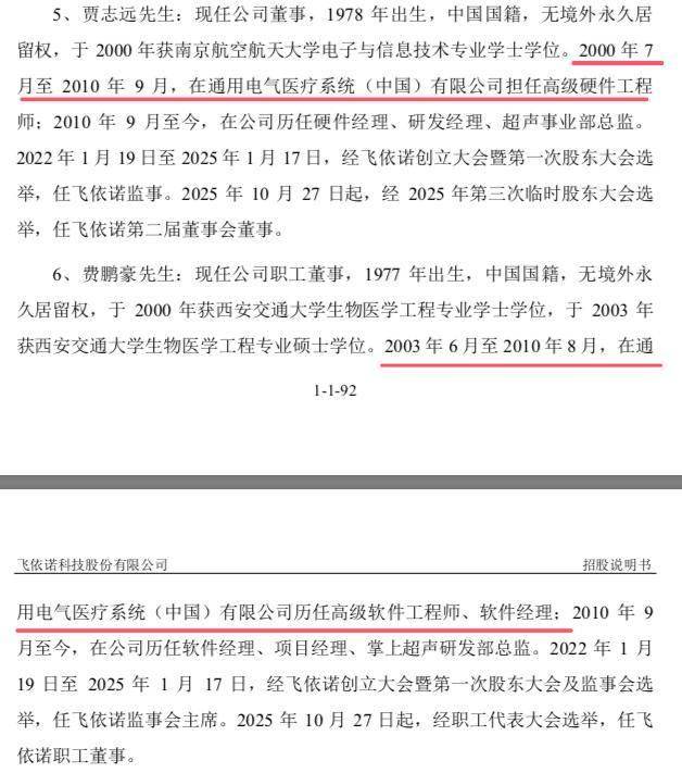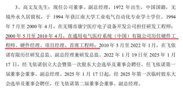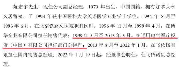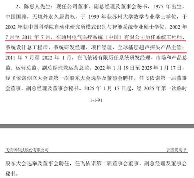 此外,公司还有5名高管在入职飞依诺前,都曾任职通用电气,其中包括:董事、副总经理及董事会秘书陈惠人,董事、副总经理高文友,董事、超声事业部总监贾志远,职工董事、掌上超声研发部总监费鹏豪,副总经理苑宏宇。