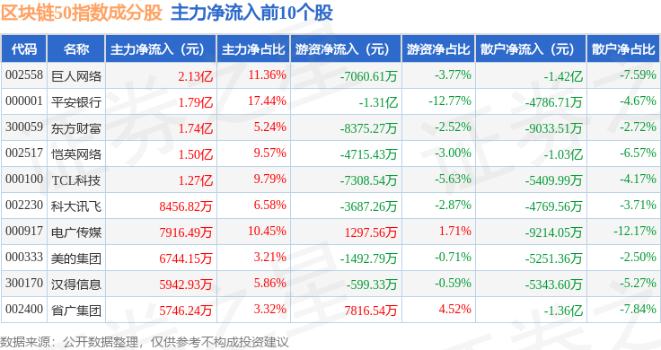 资金流向方面,区块链50(399286)指数成份股当日主力资金净流入合计7.59亿元,游资资金净流出合计6.48亿元,散户资金净流出合计1.11亿元。成份股资金流向详情见下表: