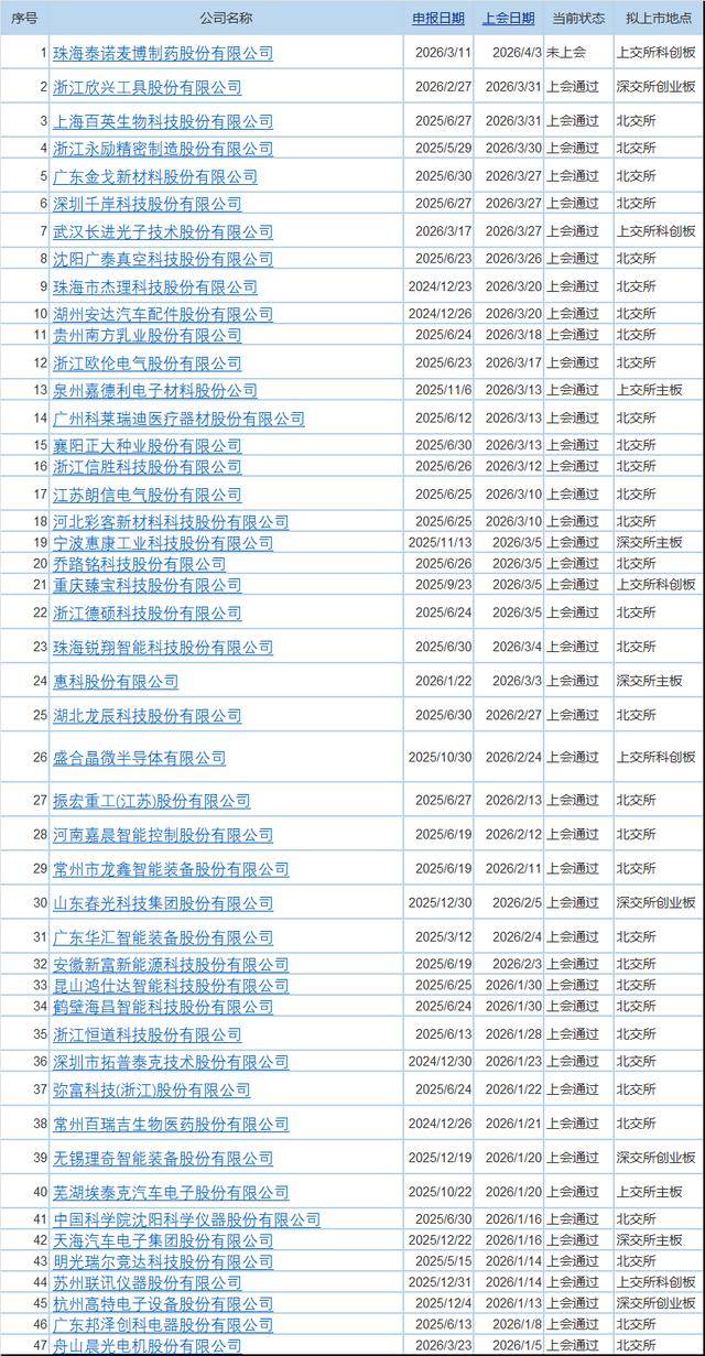 先看整体节奏。一季度,A股市场共有46家公司成功上会。从时间线看,3月中下旬成为审核高峰期,浙江欣兴、上海百英、武汉长进等公司密集过会,显示出监管层对优质企业上市的窗口期正在敞开。