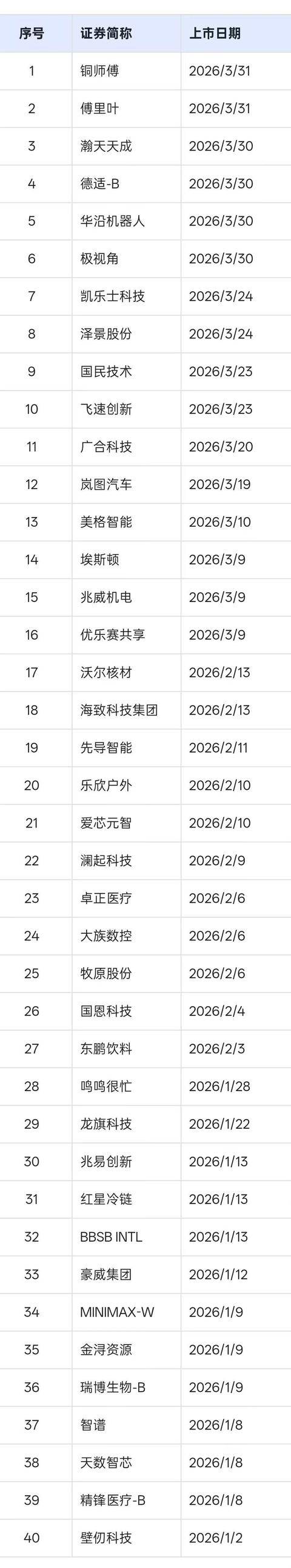 一季度港股共迎来40只新股上市,数量较去年同期的16只实现翻倍式增长。首日表现方面,共有6只新股实现翻倍上涨。其中,海致科技集团以242.2%的涨幅领跑;极视角首日大涨150%;德适-B涨幅达111.72%;MINIMAX-W、乐欣户外、傅里叶涨幅也均在100%以上。