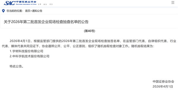 快科技4月1日消息,今日,中国证券业协会官网发布“2026年第二批首发企业现场检查抽查名单”,宇树科技股份有限公司被抽中现场检查。