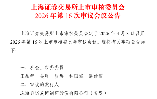 根据上交所的安排,上交所上市审核委员会将于4月3日召开2026年第16次上市审核委员会审议会议,审议珠海泰诺麦博制药股份有限公司(简称“泰诺麦博”)的首发事宜。