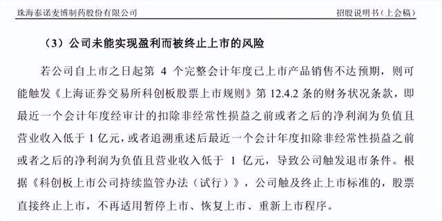 实际上,泰诺麦博也深知公司所处的困境,所以在招股书里也做了退市风险提示。如果从上市之后的第4个完整会计年度起,公司仍然不能实现盈利,且营业收入低于1亿元,即公司面临终止上市的风险。而这个风险是投资者时刻需要牢记的。