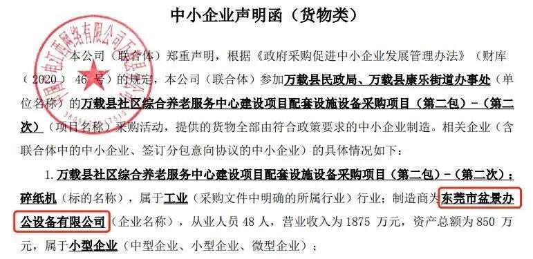 2025年1月,江西省公共资源交易平台发布“万载县政府采购中心关于万载县社区综合养老服务中心建设项目配套设施设备采购项目(第二包)-(第二次)(项目编号:中心-WZ2024-31-2)电子化公开招标采购中标结果公示”。公示附件披露,盆景公司的从业人员为48人,营业收入为1,875万元,资产总额为850万元,将承担碎纸机相关工作。