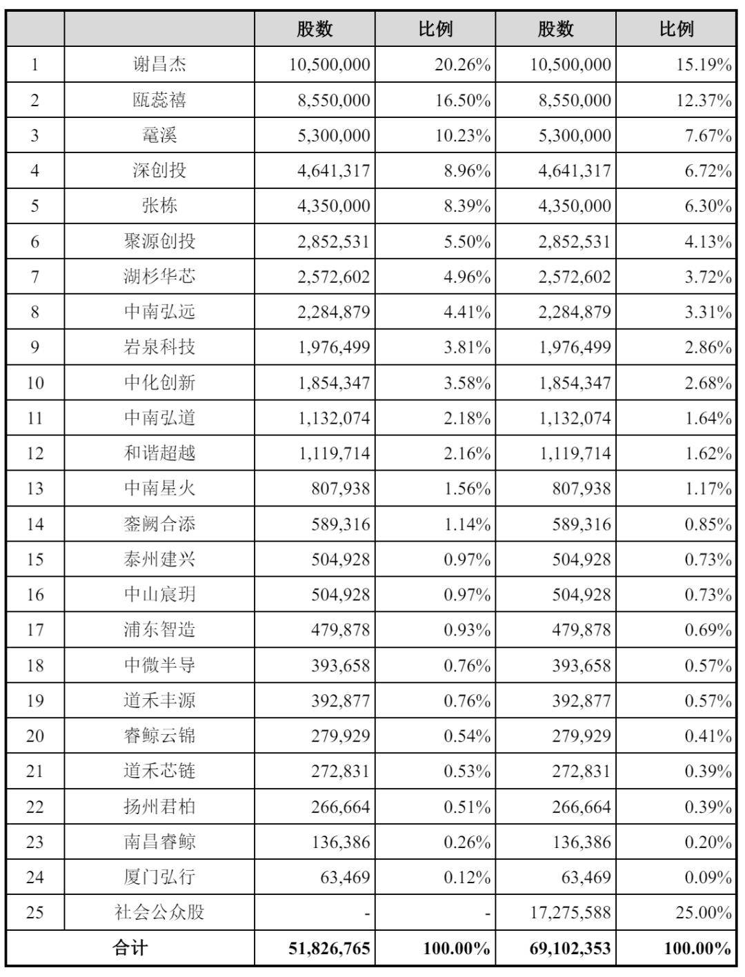 中南星火持股为1.56%,銮阙合添持股为1.14%,泰州建兴、中山宸玥分别持股为0.97%,浦东智造持股为0.93%,中微半导、道禾丰源分别持股为0.76%,睿鲸云锦持股为0.54%,道禾芯链持股为0.53%,扬州君柏持股为0.51%,南昌睿鲸持股为0.26%,厦门弘行持股为0.12%。