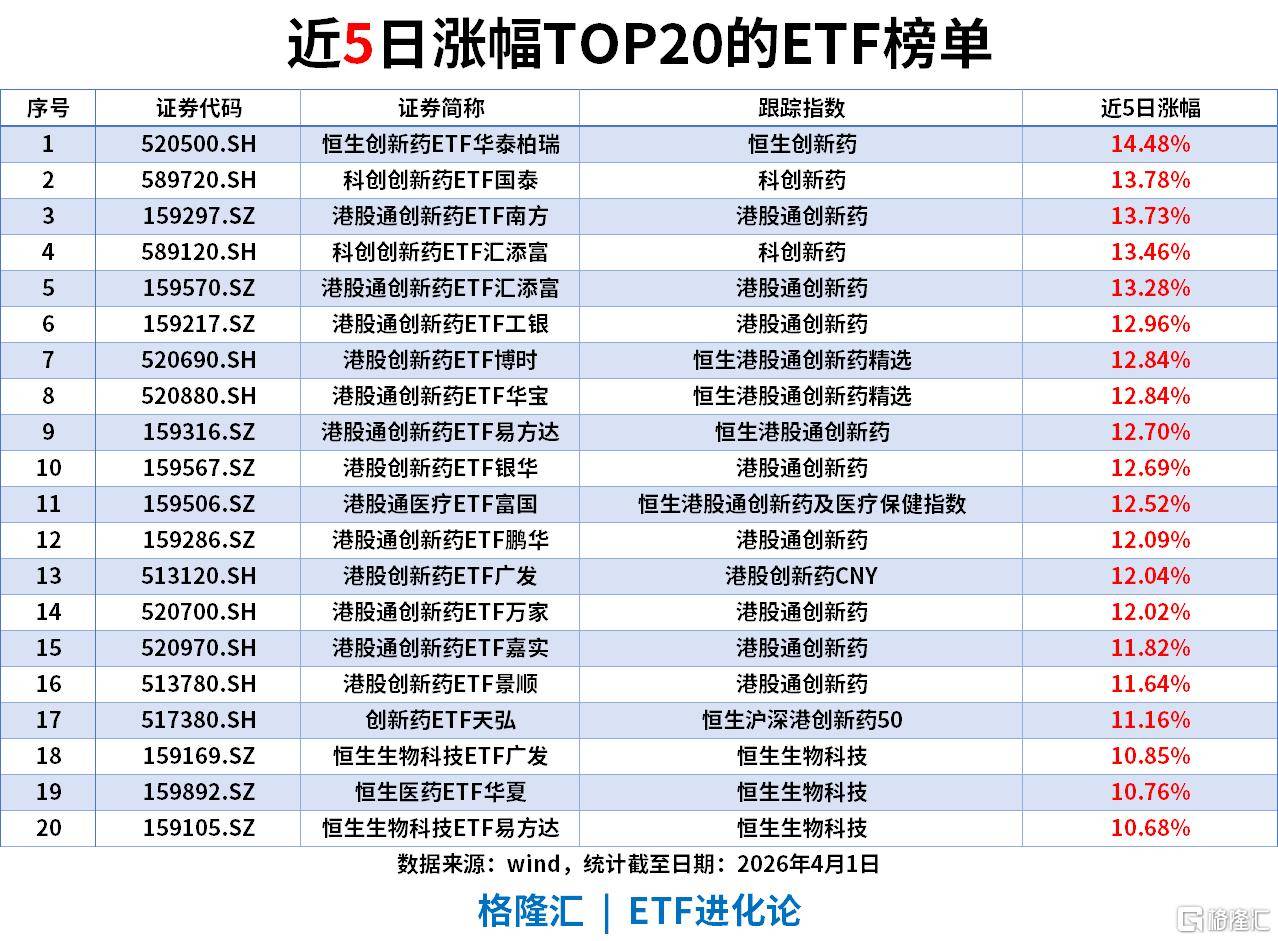 恒生创新药、港股通创新药、科创新药等医药相关ETF包揽榜单前16位,涨幅集中在15.40%-21.20%区间,恒生创新药ETF以21.20%涨幅登顶,医药创新成为中期绝对主线。