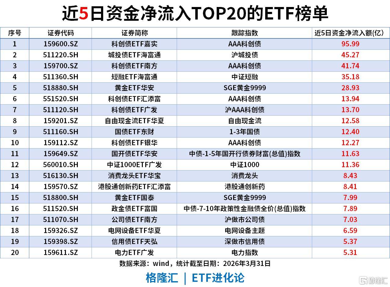 黄金与避险资产:黄金ETF华安以16.90亿净流入领跑,叠加黄金股ETF、黄金ETF易方达,黄金相关品种合计流入超24亿,避险需求集中释放;科创债、城投债、国债等固收类同步获大额加仓,合计流入超40亿,低风险资产仍是资金“安全港”。
