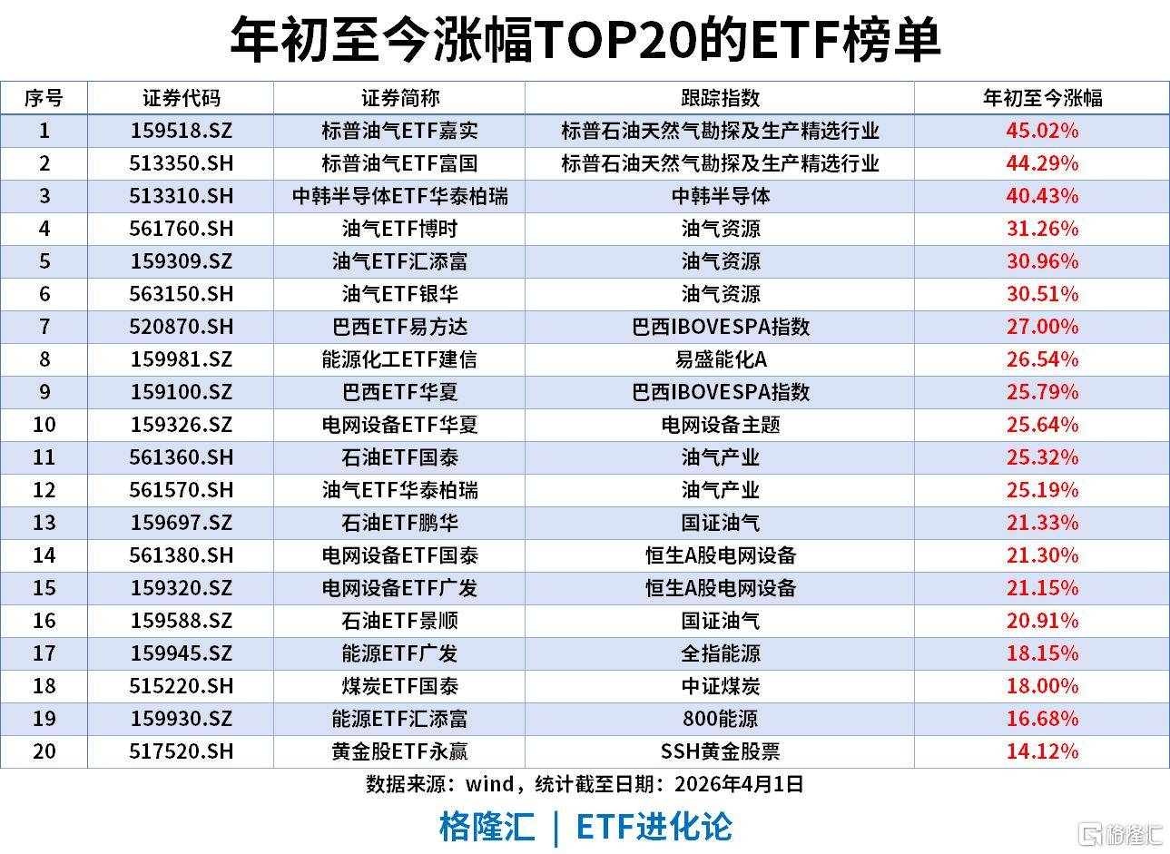 油气资源、能源化工、电网设备、石油、煤炭等能源全产业链ETF批量收获14%-31%涨幅,巴西ETF、黄金股ETF等全球资源品也进入榜单,能源资源行情贯穿全年,医药创新仅为阶段性行情,未进入年度领涨梯队。