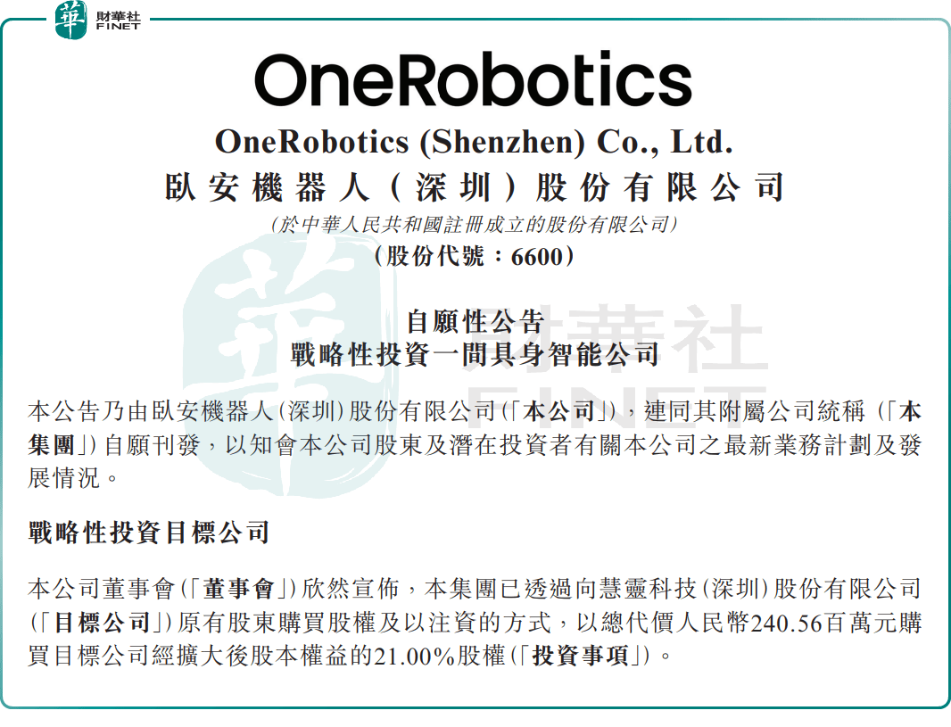 3月31日,卧安机器人宣布,以总代价2.41亿元(单位人民币,下同)战略投资慧灵科技21%股权,通过购买原有股东股权及注资方式完成。