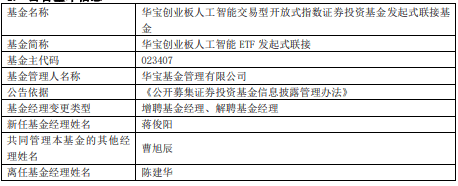 中国经济网北京4月1日讯 今日,华宝基金公告,华宝创业板人工智能ETF、华宝创业板人工智能ETF发起式联接增聘蒋俊阳,陈建华离任。