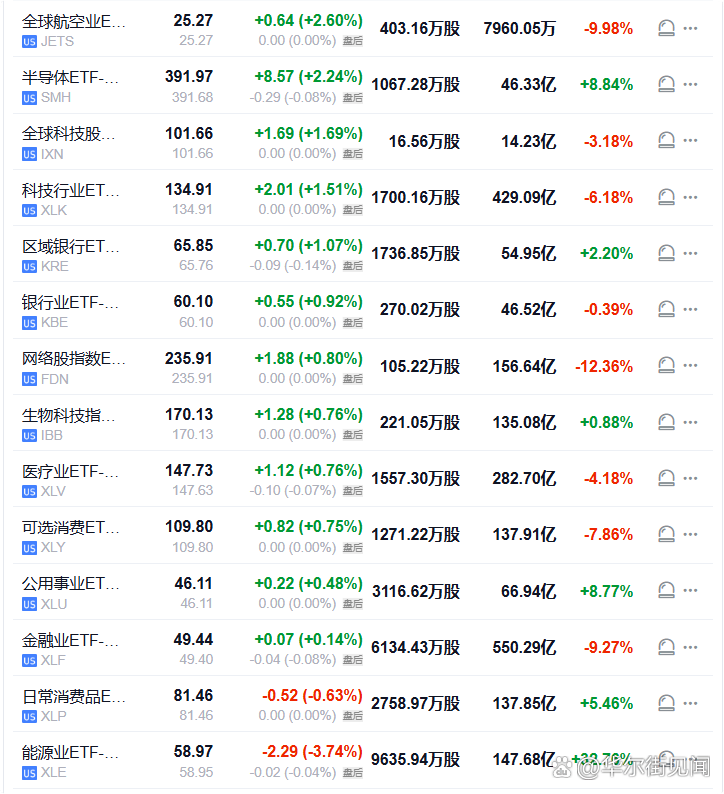 【航空业ETF收涨2.6%,和半导体ETF领跑美股大类资产类ETF,能源业ETF跌超3.7%】周三(4月1日),全球航空业ETF收涨2.60%,半导体ETF涨2.24%,全球科技股指数ETF、科技行业ETF至少涨1.51%,区域银行ETF涨1.07%,能源业ETF跌3.74%。