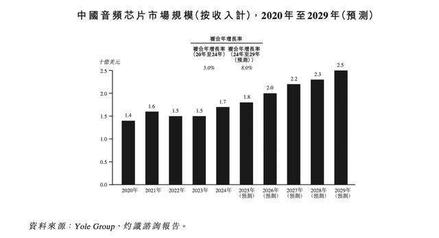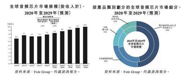 受消费电子升级、智能语音应用的普及及汽车智能化加速推动,音频芯片市场持续扩张。按收入计,全球音频芯片市场规模从2020年的68亿美元增长至2024年的79亿美元,复合年增长率为3.8%。预计到2029年将达100亿美元,2024年至2029年间复合年增长率为4.8%。