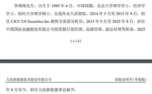 李博闻,出生于1989年4月,中国国籍,北京大学理学学士、经济学学士,纽约大学理学硕士,无境外永久居留权。2014年5月至2015年9月,担任CICC US Securities Inc销售交易部分析员;2015年9月至2025年8月,担任中国国际金融股份有限公司投资银行部经理、高级经理、副总经理等职务;2025年8月至今,担任力高新能董事会秘书。