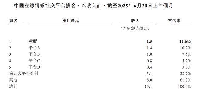 截至2025年6月30日止六个月,伊对以15亿元收入位列中国在线情感社交市场第一,不过,截至2025年6月30日,其平均月活跃用户为4.8百万人,远低于排名前两位的竞争对手(平台B为30.0百万人、平台A为11.0百万人)。