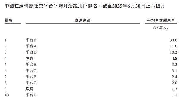 截至2025年6月30日止六个月,伊对和贴贴的平均月活跃用户分别为4.8百万人和1.7百万人,在中国在线情感社交平台中分别排名第四和第九。