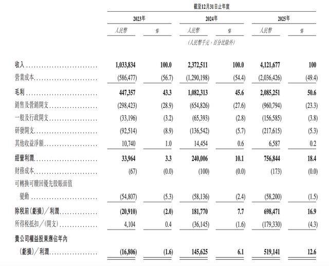 财务表现上,2023年~2025年,米连科技的收入分别为10.34亿元、23.73亿元及41.22亿元;公司毛利分别为4.47亿元、10.82亿元及20.85亿元,同期的毛利率分别为43.3%、45.6%及50.6%。