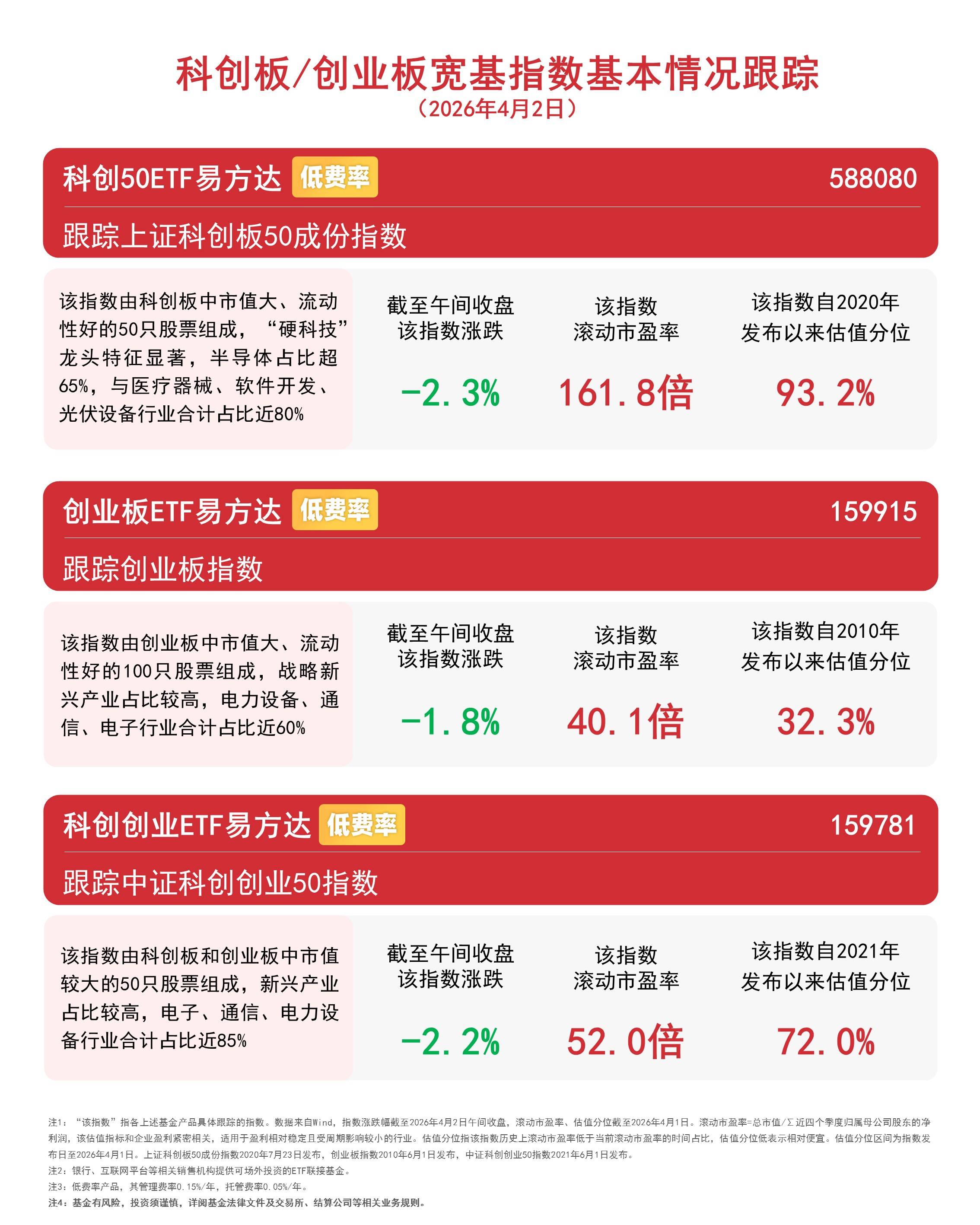 4月2日早盘,半导体设备、集成电路、光伏设备等双创权重板块走弱,指数层面,创业板指数下跌1.8%,中证科创创业50指数下跌2.2%,上证科创板50成份指数下跌2.3%,创业板ETF易方达(159915,联接基金A/C/Y:110026/004744/022907)和科创创业ETF易方达(159781,联接基金A/C/Y:013304/013305/022910)半日净申购分别达5100万份和3300万份。