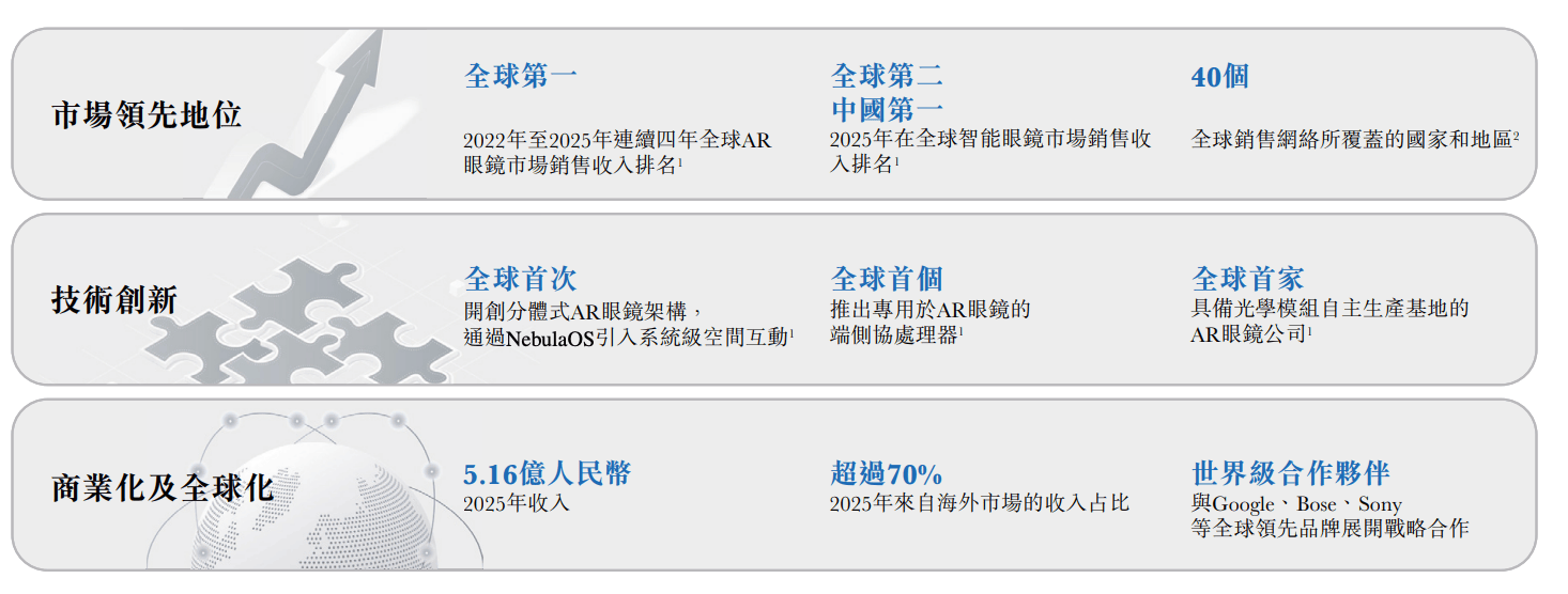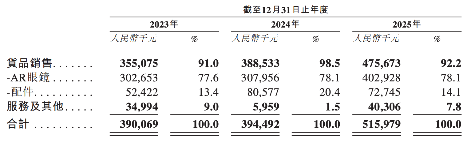 目前该公司的主营业务包括AR眼镜和配件,其中2023年至2025年来自AR眼镜的收入均超过77%。