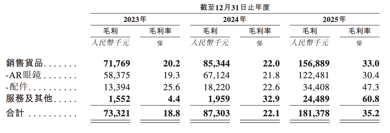 毛利率方面,2023年、2024年、2025年分别为18.8%、22.1%、35.2%。其2025年毛利率大幅提升,是由于One系列等高利润率产品对销售的贡献增加,并由此带来规模经济效益降低了平均单位生产成本。AR眼镜的平均毛利率分别为19.3%、21.8%、30.4%