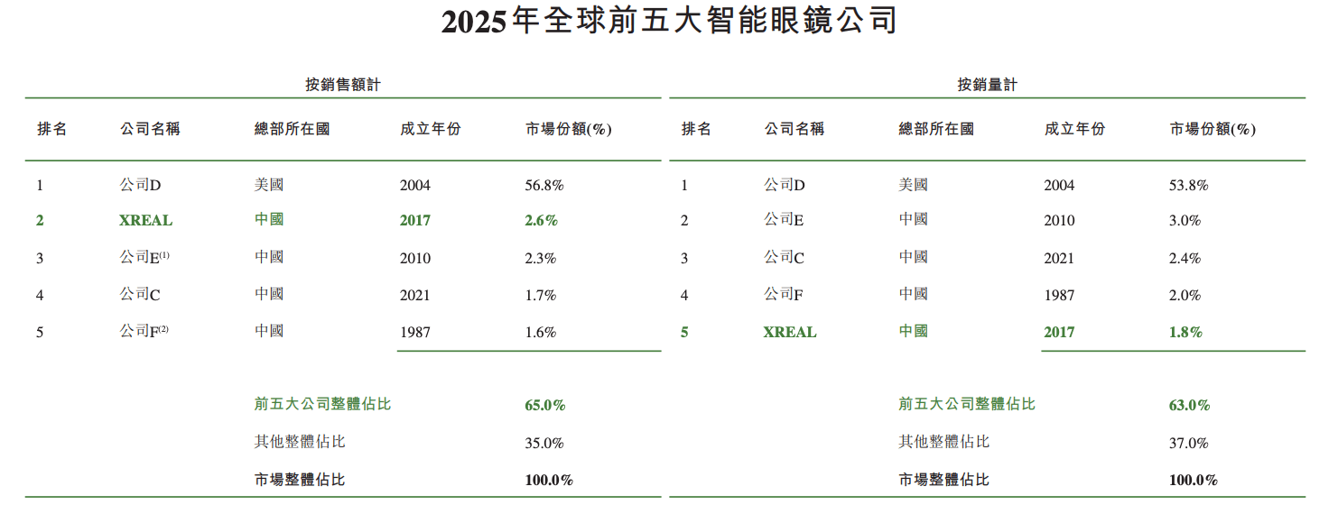 按2025年销售收入计,XREAL在包含AR眼镜和无显示眼镜的整个智能眼镜市场排名全球第二、中国第一。按批注估计公司E为小米、F为华为。