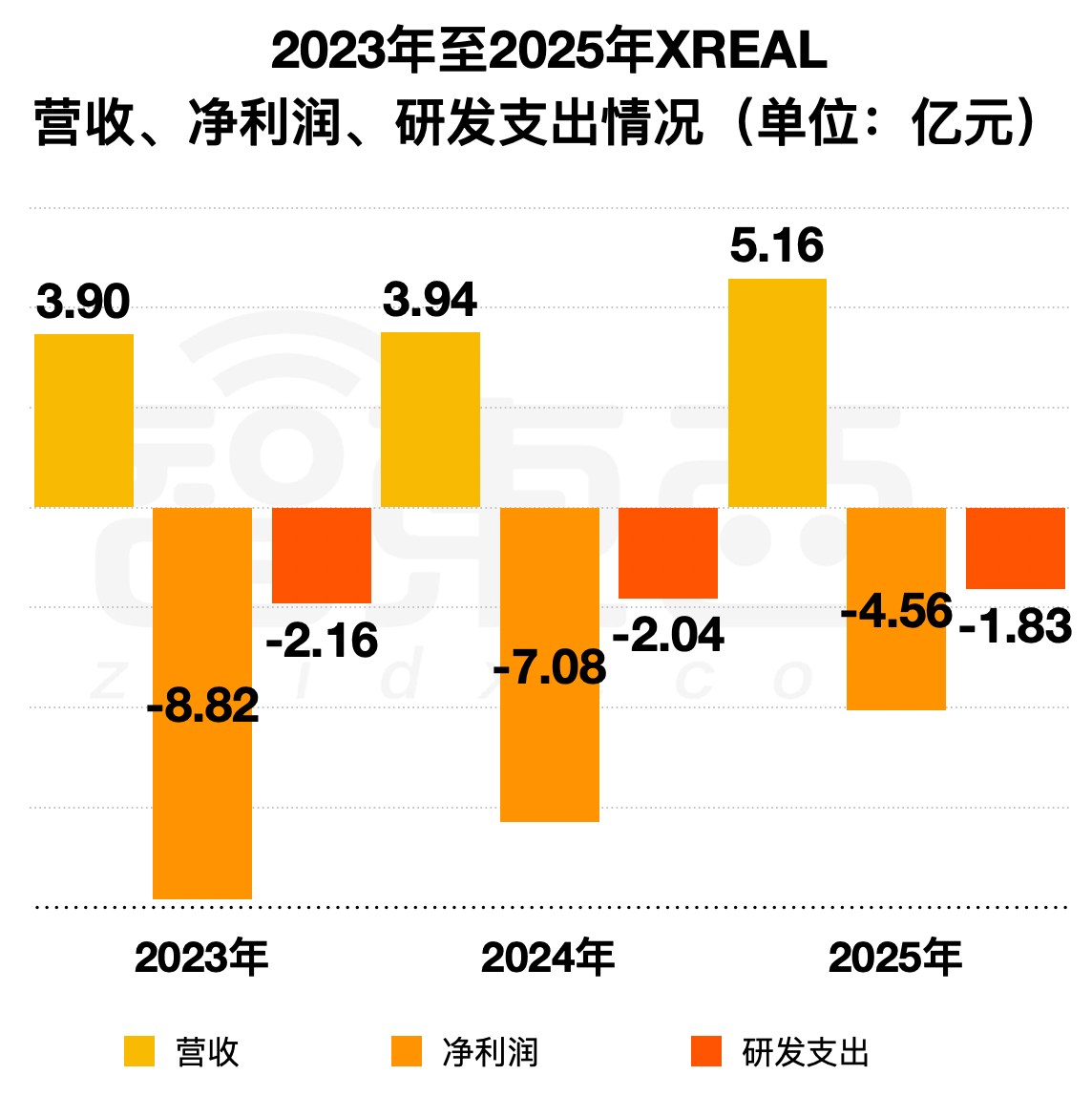 ▲2023年至2025年XREAL营收、净利润、研发支出情况(智东西制图)