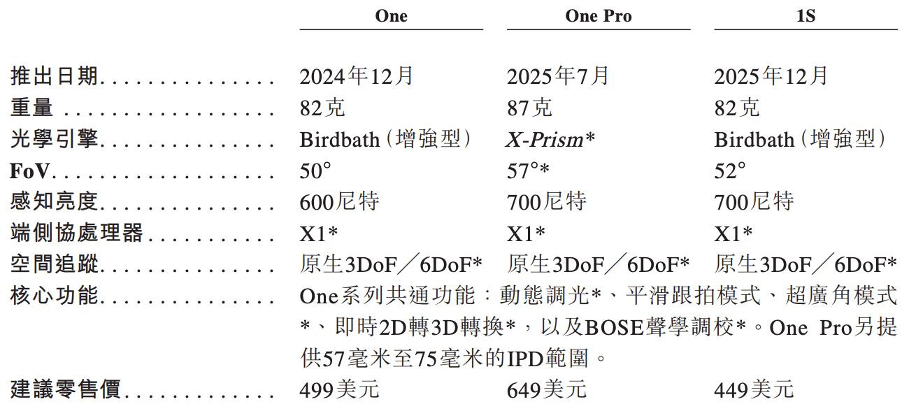 One系列进一步强化了显示和交互能力。其设备搭载了Micro-OLED显示技术、定制化X1端侧协处理器及可根据不同光线条件自动调节亮度的电致变色镜片。