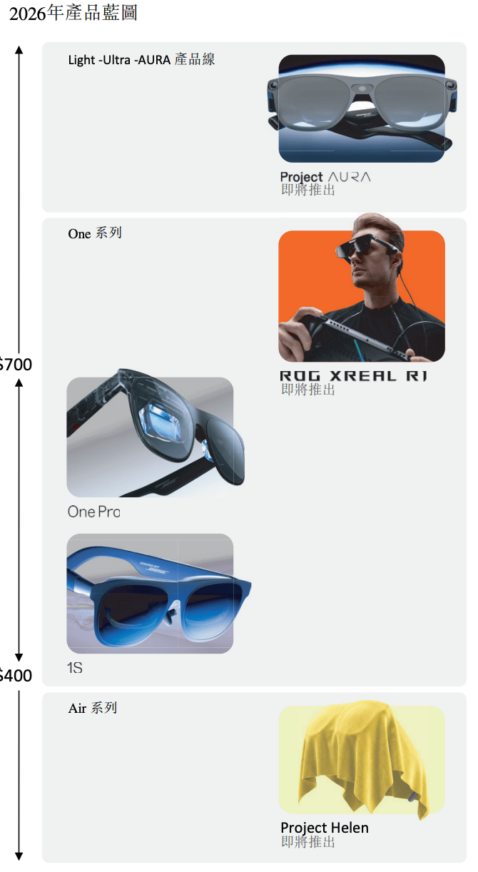 XREAL在招股书中透露了2026年的新产品动向,包括与华硕ROG合作、面向游戏的ROG XREAL R1;Air系列的新品Project Helen,旨在以更具竞争力的价格触达更广泛用户;与谷歌在安卓XR平台上开发的下一代旗舰产品Project Aura。
